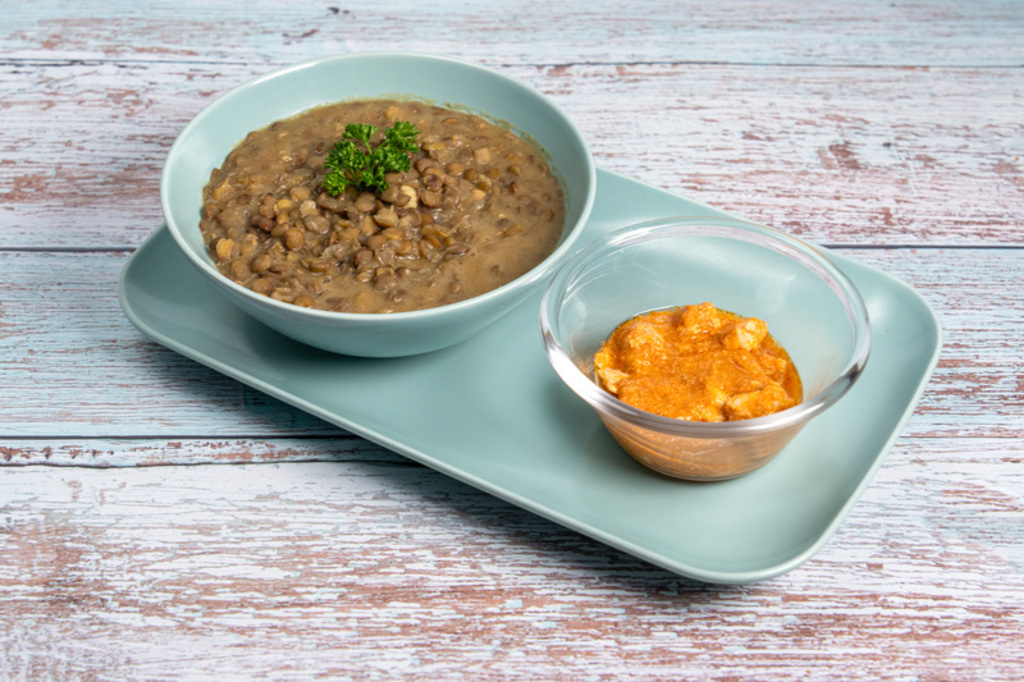 babérlevéllel és ecettel ízesített krémes lencsefőzelék csirkepörkölttel