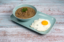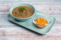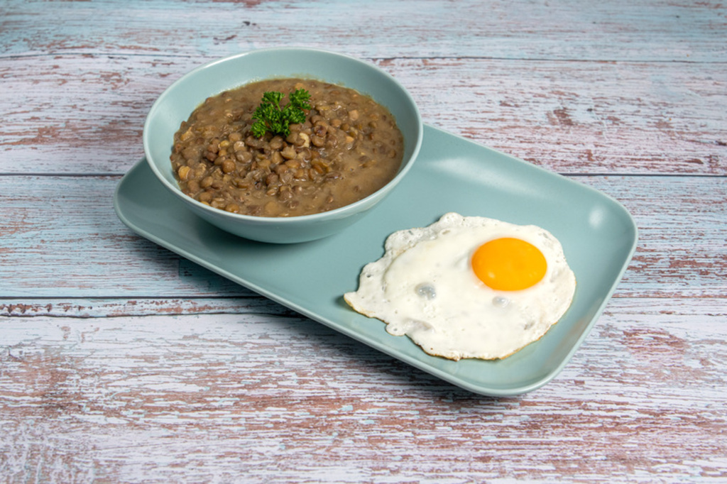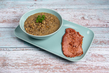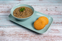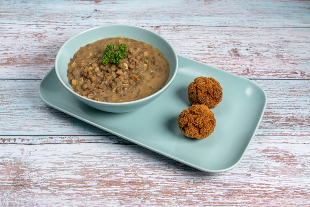 babérlevéllel, ecettel ízesített krémes lencsefőzelék 2 db fasírttal