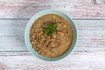 babérlevéllel és ecettel ízesített krémes lencsefőzelék