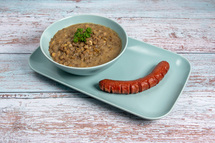 babérlevéllel és ecettel ízesített krémes lencsefőzelék sült virslivel