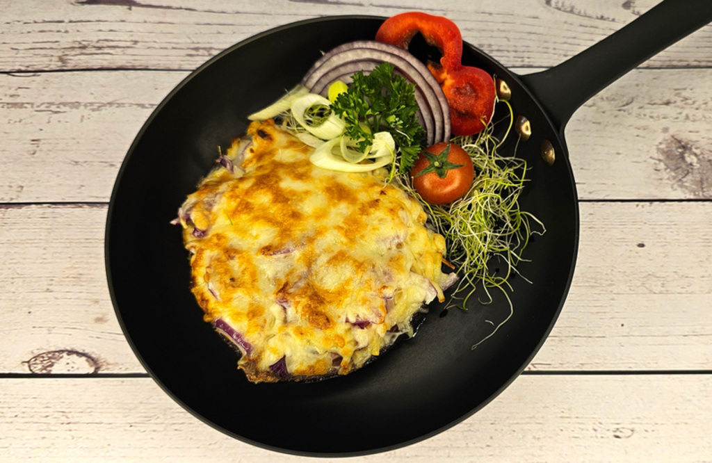 pizzatészta, lila hagyma, füstölt sajt, főtt tojás, mustáros alap, füstölt csülök, sajt