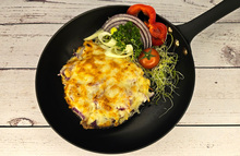 füstölt főtt csülök juhtúróval,lila hagymával és füstölt sajttal kemencében sütve